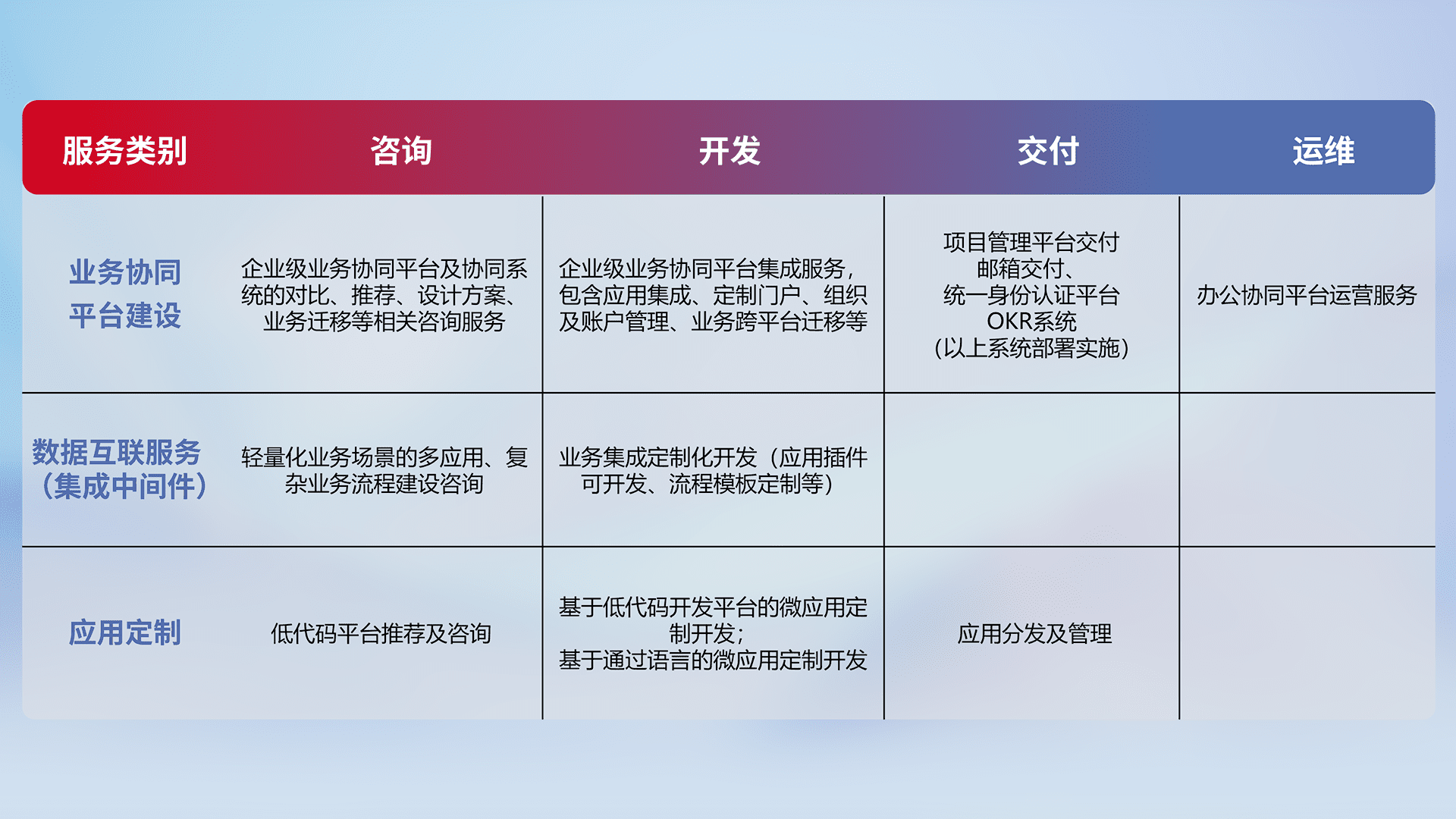 针对钉钉、、、、企微、、、、IDaas等平台级产品提供产品的规划、、、方案、、、交付、、定制化开发等服务,,,,实现如统一协同办公、、、智能客户服务、、、混合会议管理、、、、智能数据查询、、、、等业务场景,,,实现数字化转型。。